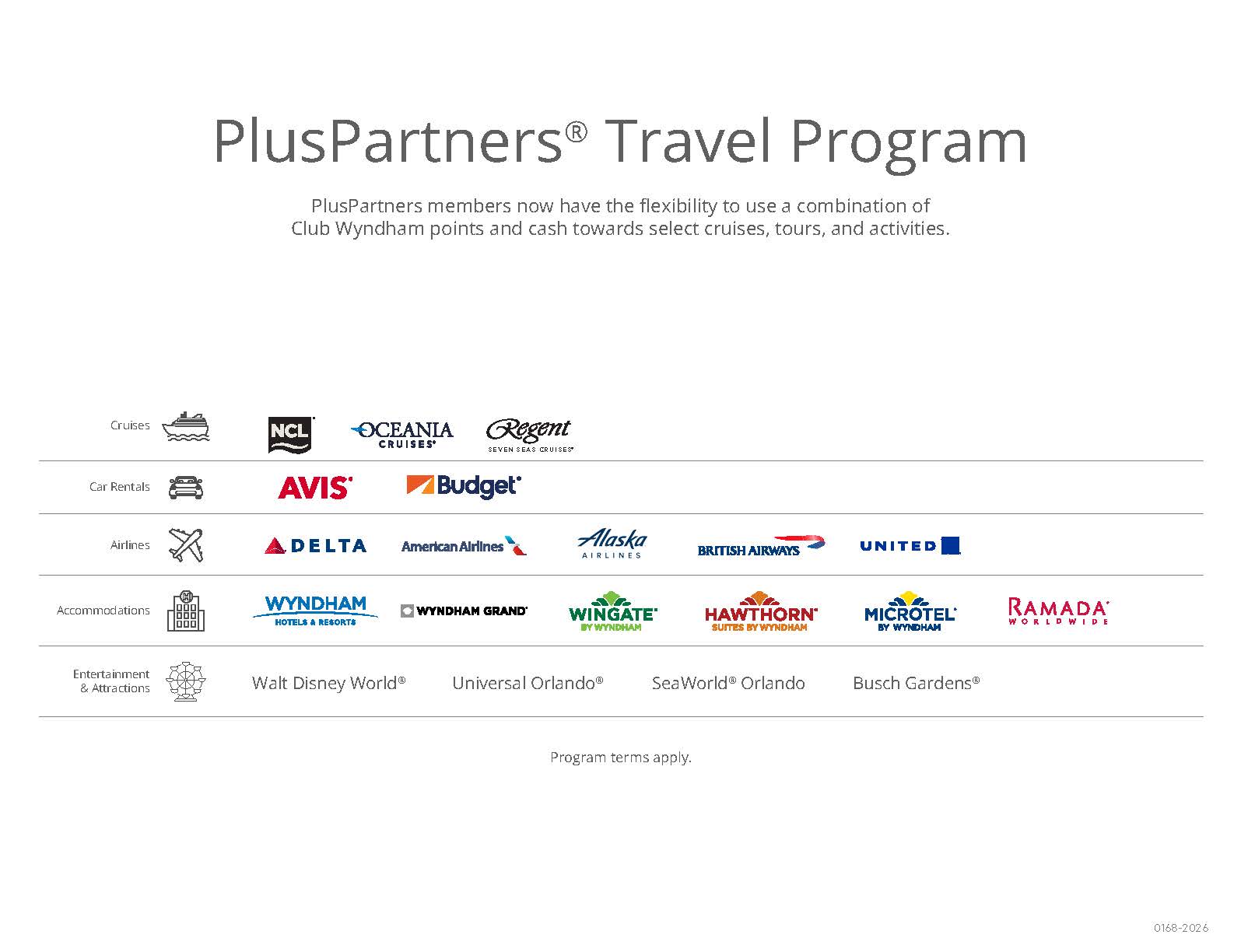 PlusPartners® is an additional membership offered to eligible Club Wyndham owners at the time of purchase, allowing you to use your points for the following travel benefits: